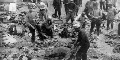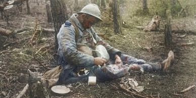 A poilu who was killed while eating a meal (most likely from artillery fire). Note the issue plate to his right on the ground.